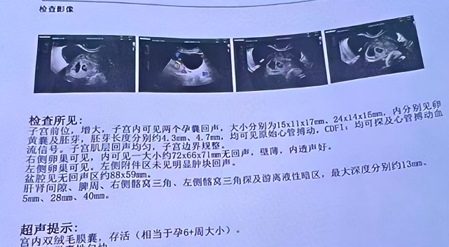 9月下旬,正在外地出差的小刘感觉身体有些异样,抱着试一试的心态购买了验孕棒,于是出现了开头那惊喜的一幕,当地医院B超确认宫内双绒毛膜囊双胎妊娠,胎心搏动良好——她不仅怀孕了,还是双胞胎!