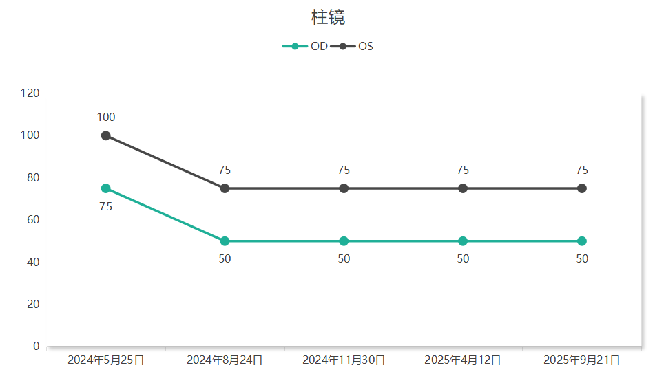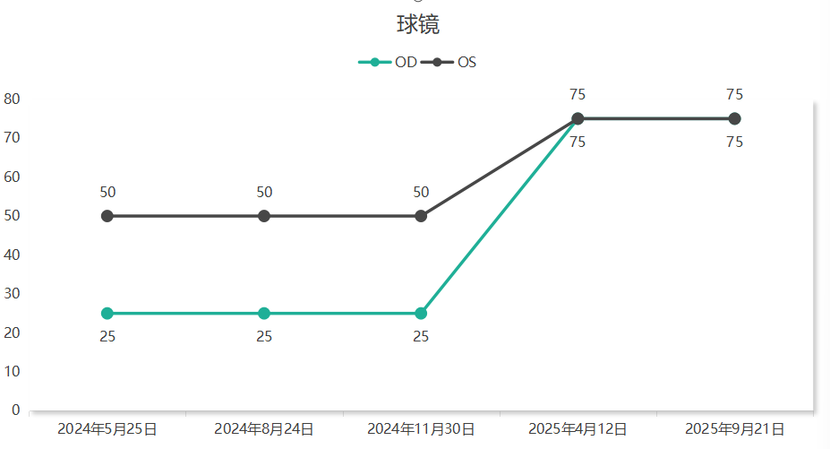 自调整近视防控方案6个月后,小昊的复查结果令人欣喜:右眼近视75度,眼轴24.53mm,左眼近视75度,眼轴24.71mm,双眼度数实现了“0增长”,眼轴甚至还出现了“回退”。