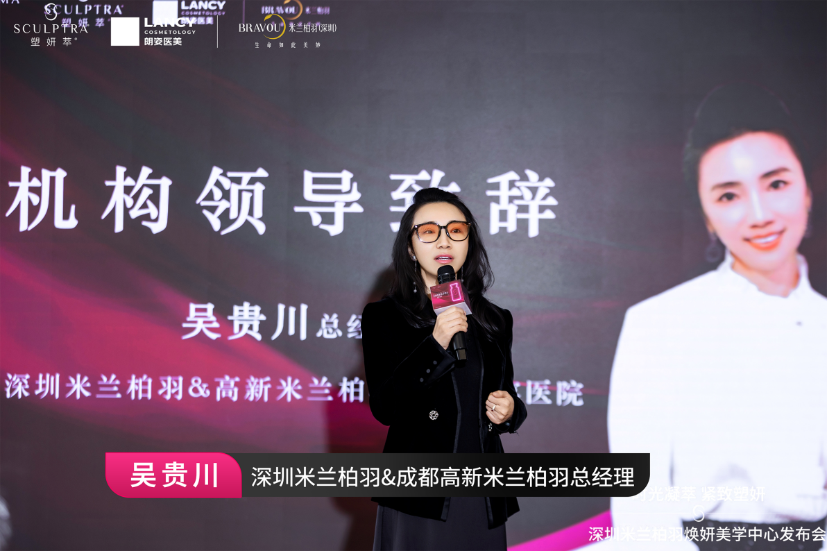 会议伊始,深圳米兰柏羽&成都高新米兰柏羽总经理吴贵川女士致开幕辞,她介绍,深圳米兰柏羽作为粤港澳大湾区医美新地标,始终秉持着高端品质医美的发展定位,深圳米兰柏羽始终以“医美回归医疗”的理念,依托国际前沿技术、顶尖专家团队和严苛服务体系,为求美者提供安全、精准的美学方案。多年来,深圳米兰柏羽与包括高德美在内的全球一线医美品牌达成战略合作,共同引入并规范应用如“塑妍萃”这类经过长期全球验证的再生材料。并且致力于将国际化的品质管理标准贯穿于从咨询到售后的每一个服务细节,确保求美者享受到安全、精准、可靠的高品质体验。