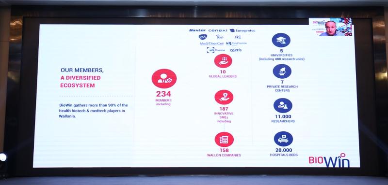 比利时瓦隆大区生命科学集群 BIOWIN国际事务负责人马克·德尚(Marc Dechamps )在视频发言中介绍到,比利时瓦隆大区在欧洲高密度的生命科学企业经济实体中,制药业是经济增长的主动力之一;比利时人均药品研发水平以及投资在欧洲位居第二。瓦隆大区生物技术方面的整体优势在欧洲排名第二,生物制造工程是瓦隆大区最普遍的业务,尤其在免疫疗法和细胞疗法方面。他在会上表示希望促进更多比利时和中国生物医学企业的对接和交流。