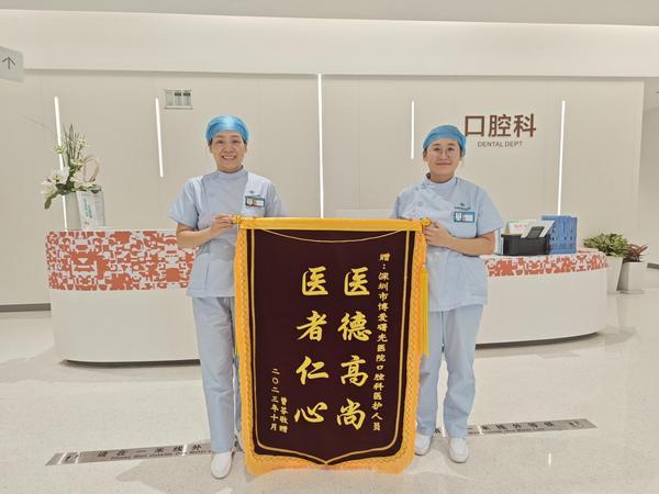 10月18日,曾女士(化姓)将印有“医德高尚,大爱无疆”,“医德高尚,医者仁心”的锦旗,分别送到深圳博爱曙光医院外科敖山水主治医师和口腔科医护人员的手上,表达对医护人员精湛技术和医德高尚的认可和赞扬。