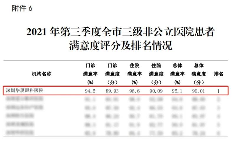 据悉,2021年第三季度,在全市非公立医院满意度排名中,深圳华厦眼科医院以90.01分排名第一。