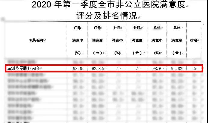 2020年第一季度,在全市非公立医院满意度排名中,深圳华厦眼科医院以92.82分排名第二。