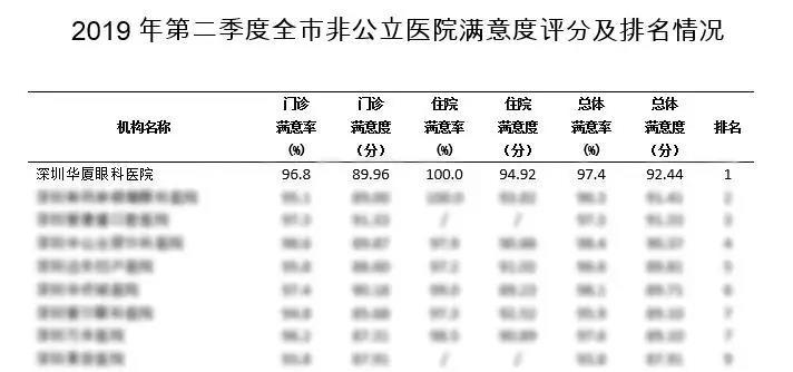 2019年第二季度,在全市非公立医院满意度排名中,深圳华厦眼科医院以92.44分排名第一。